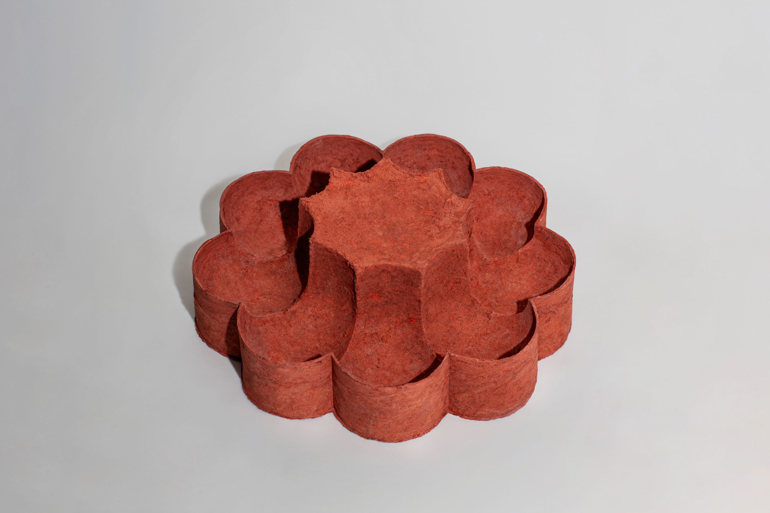 The color of each object is created by using the inherent color of the discarded material itself as a single tone, or by blending multiple colors together to form a custom color palette.